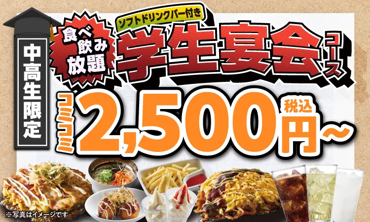 - ※中高生限定・学生宴会には小学生半額・幼児無料・シニア300円引は適用されません