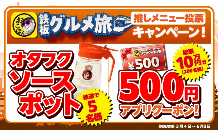 「500円分のお好み焼本舗本舗のアプリクーポン」を抽選で200名様、または、オタフクソースポットを抽選で5名様にプレゼント