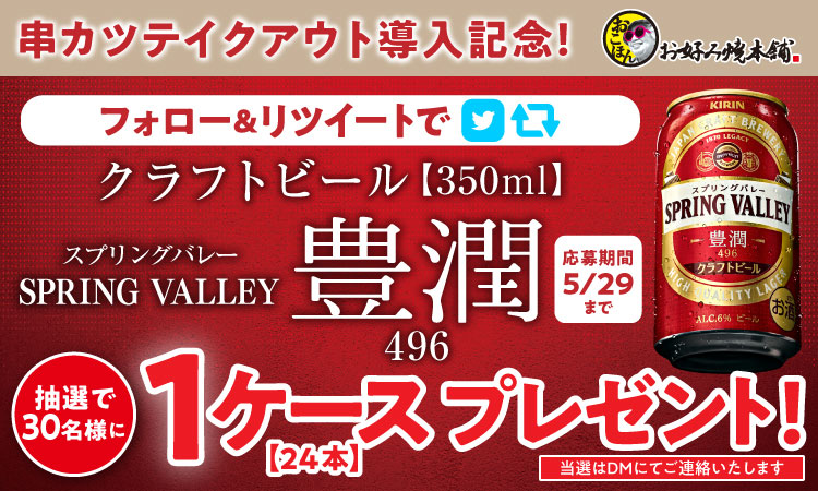 - 抽選で30名様にKIRIN「SPRING VALLEY 豊潤<496>」1ケース(350ml×24本入り)をプレゼント