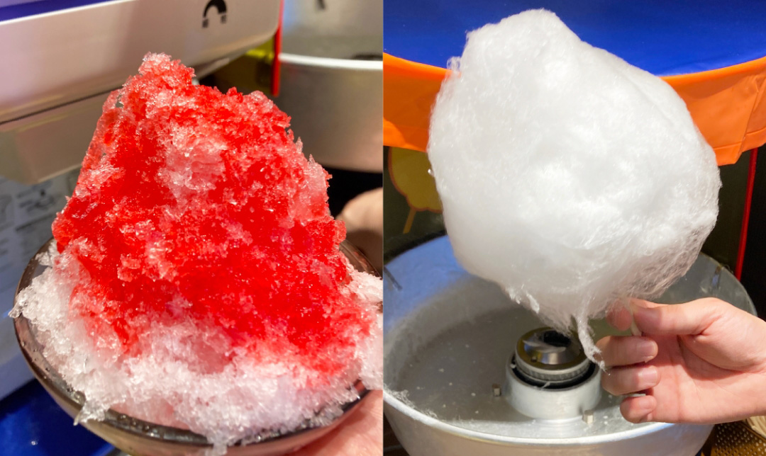 誰でも「わたがし」と「かき氷」が楽しめます。 ソフトクリームの上にかき氷を乗せるとさらに美味しい♪