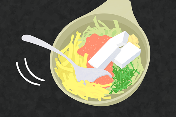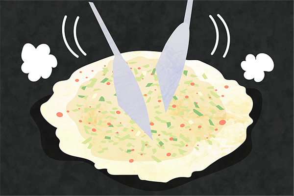 ④テコで混ぜ合わせながら刻んで、丸く平らに伸ばす